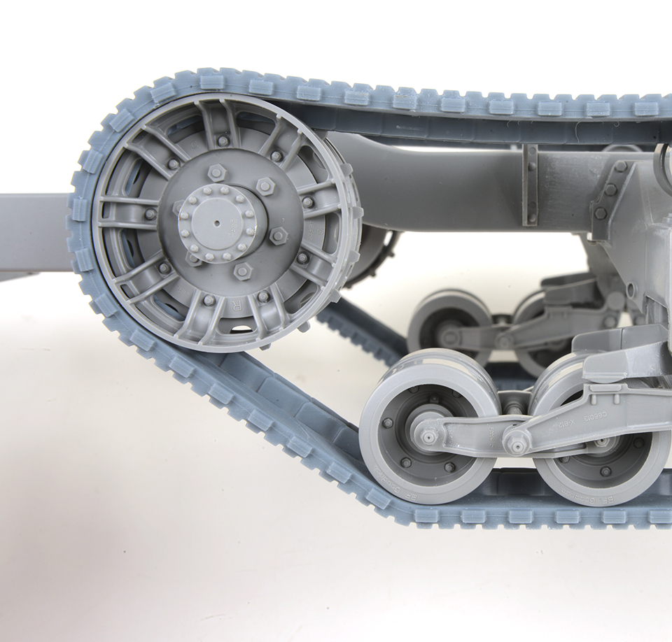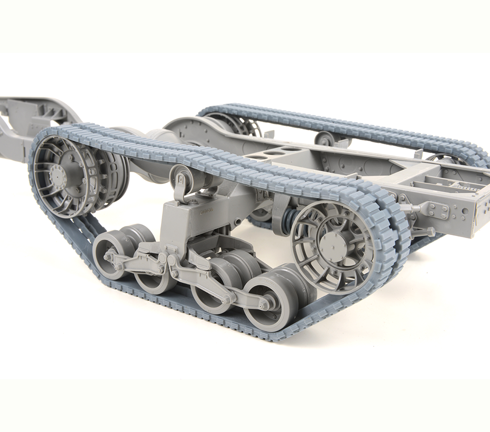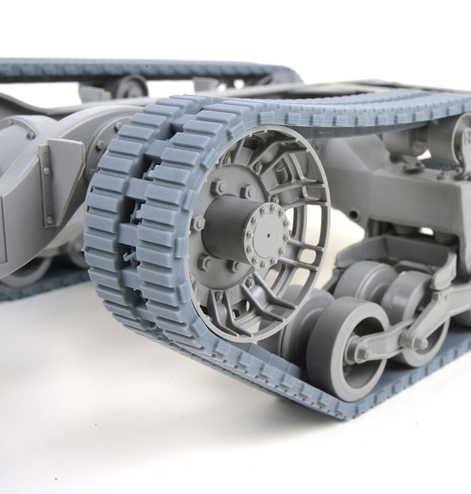 This set replaces the kit tracks for a more realistic appearance offering a very slight sagged appearance seen on some vehicles tracks. These are 3D printed as a single piece to fit the kit bogies exactly. There is sufficient flex in the track to permit them to be fitted over the centre bogie but you will need your sprocket and idler wheels to be separate from the chassis in order to fit the tracks.