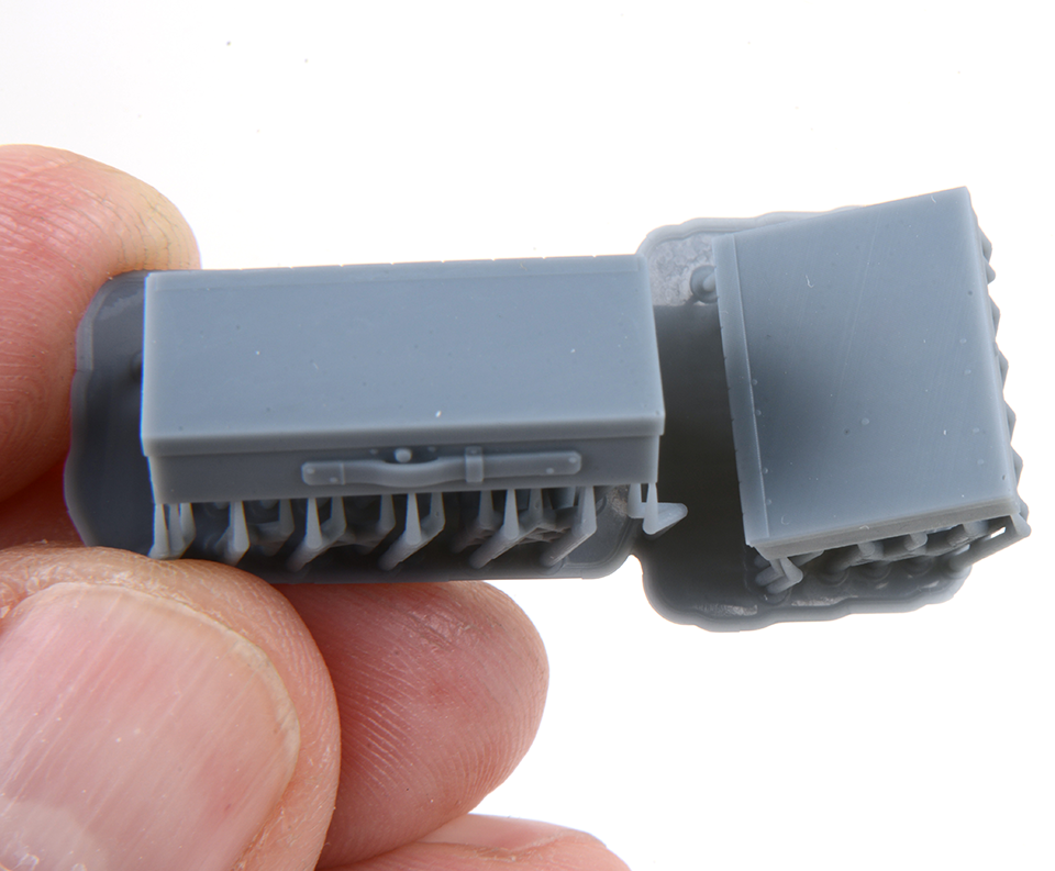 Standard equipment for German Armoured vehicles equipped with MG 34, the Werkzeug or toolbox carried all the maintenance parts for the Machine Gun. The Zubehor or accessories box carried parts like the stowed butt stock, and AA ring sight. Sold as a set of 4 boxes, two of each type to go with the two MGs mounted in most tanks. These new 3D printed boxes replace our previous cast resin versions