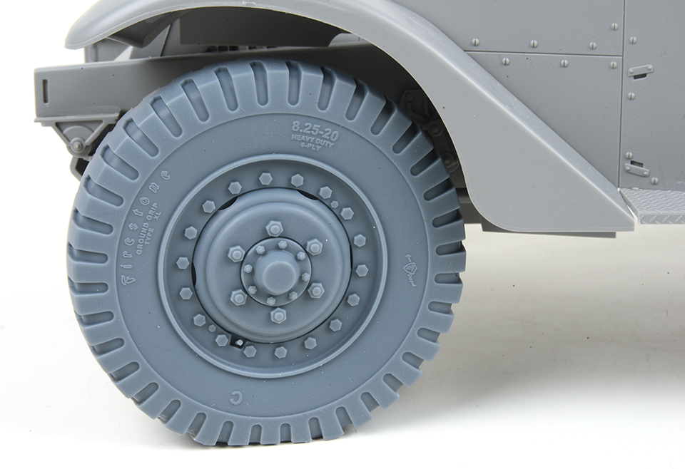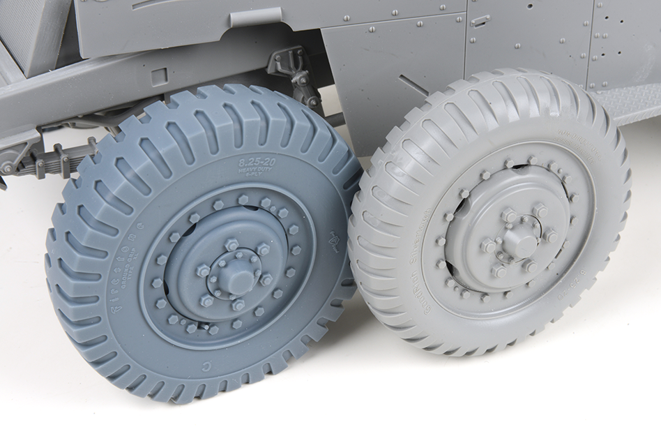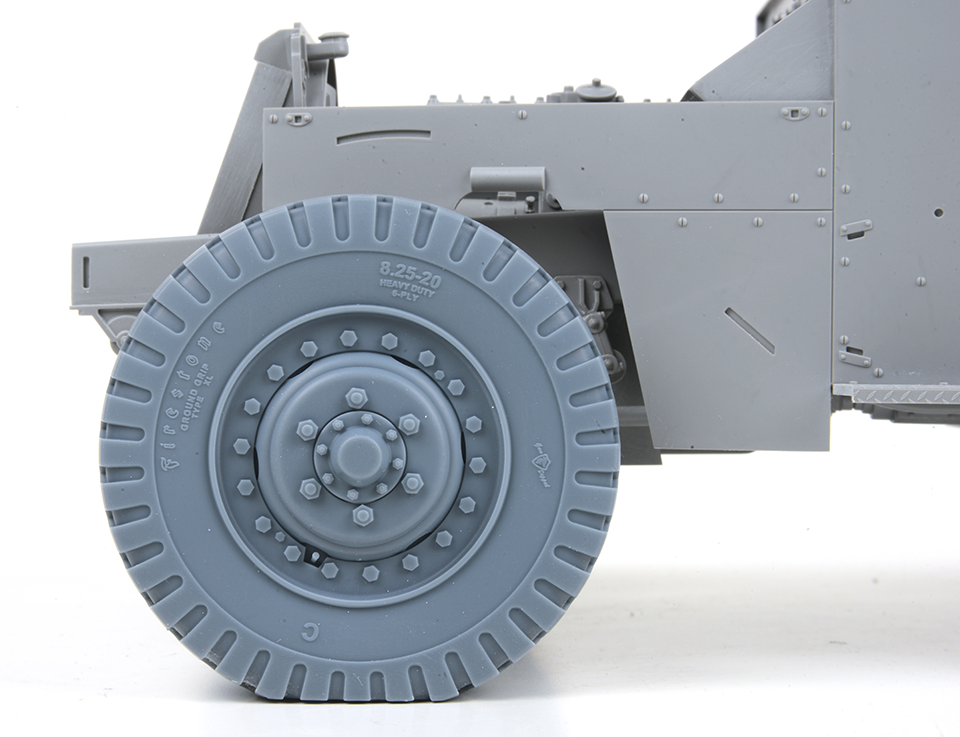 Set of two 3D printed front wheels for the AHHQ Halftrack which correct the numerous errors in the kit wheels and have a weighted effect as well as the sidewall lettering carefully replicated.