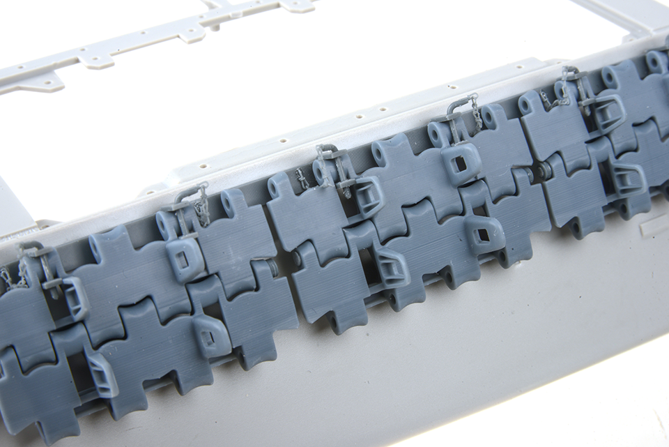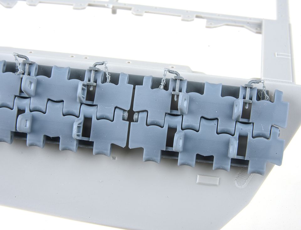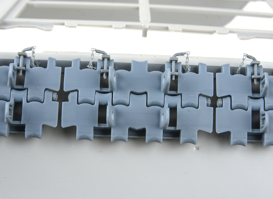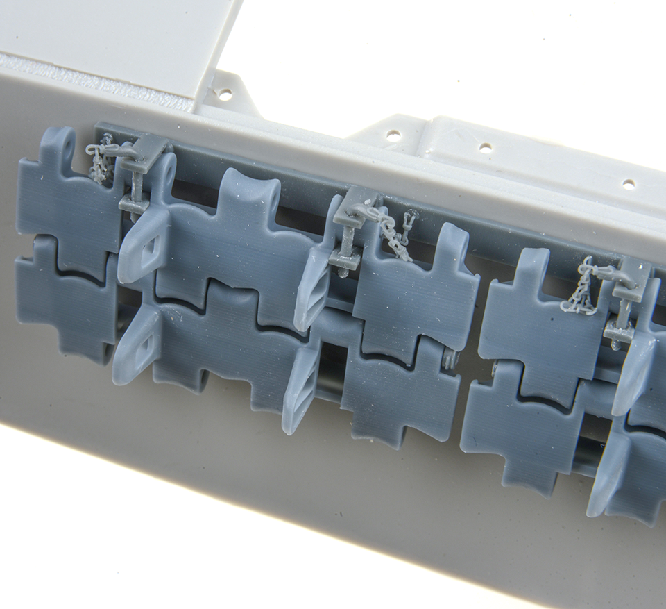 This 3D printed set of replacement spare track rails for the Panther G / Jagdpanther comes with a full set of stowed track links with separate track pins and separate working chains and pins to secure the tracks to the frames. Note that the chains are very delicate and care is required when handling them. We have replicated the pins exactly to have a small tab on the shaft for absolute accuracy however shaving or sanding off this tab will make fitting the pins into the frames much easier.