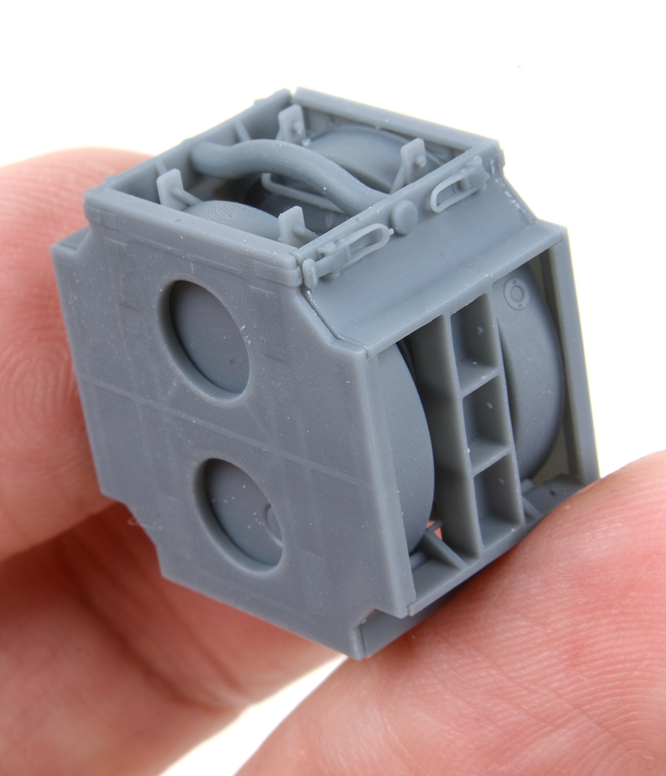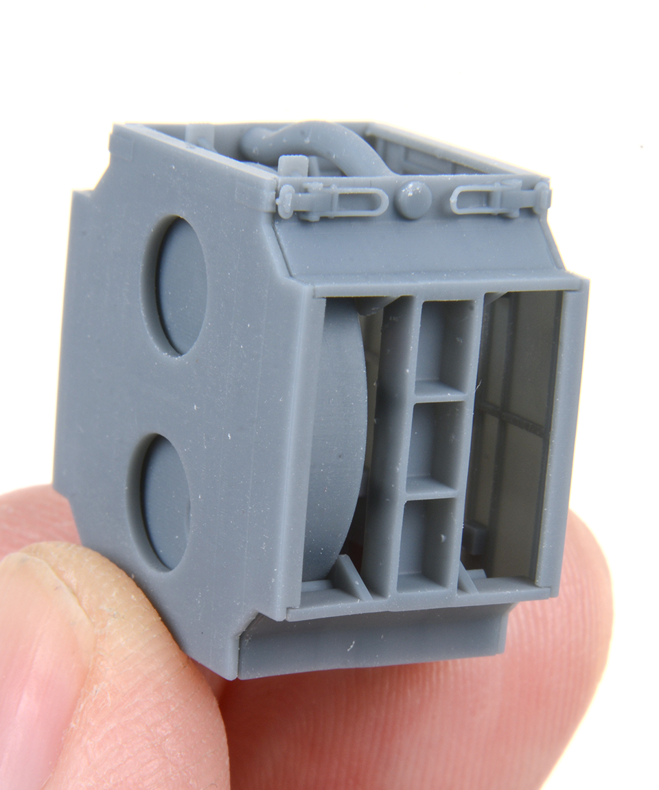 This distinctive double Tellermine case has been designed and 3D printed to allow the components to be easily painted before it is assembled with separate Tellermines and door panels which can be modelled in open or closed positions. Assembly guide is included.