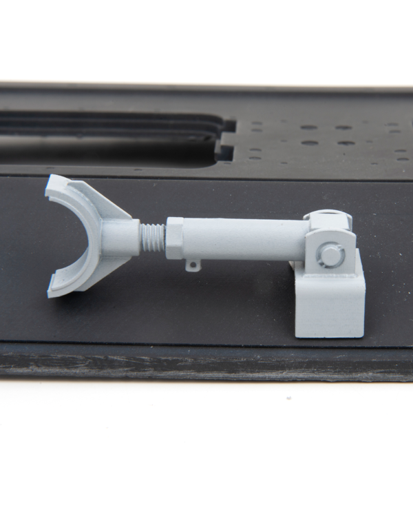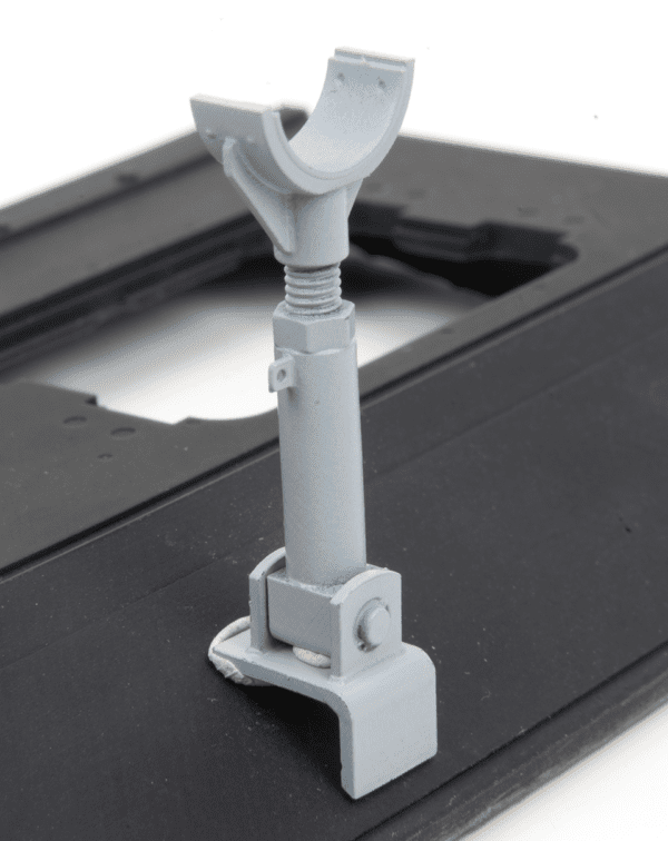 Late style gun crutch 3D printed in two parts so that it can be modelled folded up or down.