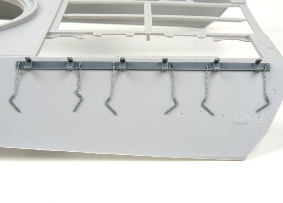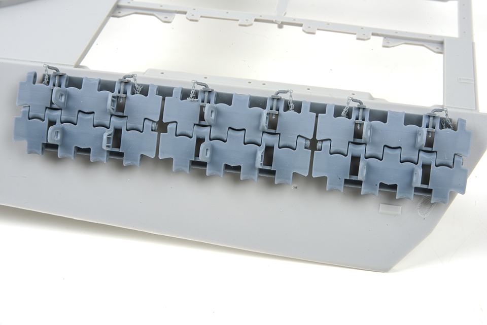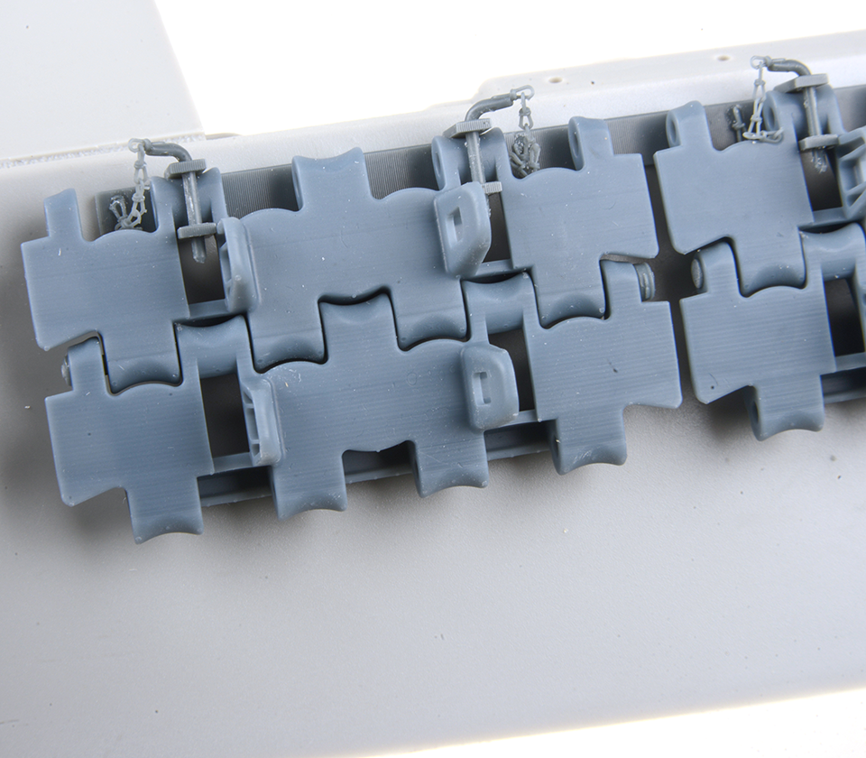 This 3D printed set of replacement spare track rails for the Panther G / Jagdpanther comes with a full set of stowed track links with separate track pins and separate working chains and pins to secure the tracks to the frames. Note that the chains are very delicate and care is required when handling them. We have replicated the pins exactly to have a small tab on the shaft for absolute accuracy however shaving or sanding off this tab will make fitting the pins into the frames much easier.